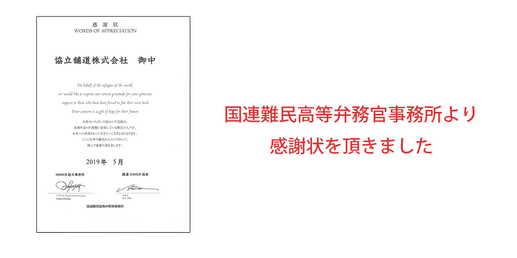 7月222019CSR UNHCRへの寄付活動により感謝状をいただきました。 カテゴリー: CSR投稿者:協立舗道株式会社2019年7月22日Post navigation前へ前の投稿:ストラックアウト寄贈NextNext post:『東京2020』を応援しています関連記事ストラックアウト寄贈2019年7月17日“子供を交通事故から守ろうキャンペーン”ジュニア朝日新聞とラックを寄贈させていただきました2017年8月3日